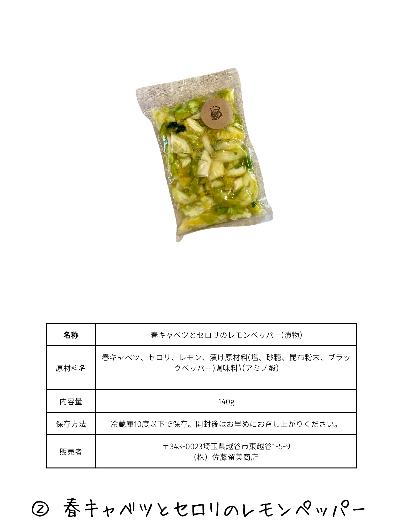 原材料名:春キャベツ、セロリ、レモン、漬け原材料(塩、砂糖、昆布粉末、ブラックペッパー)調味料\(アミノ酸)
